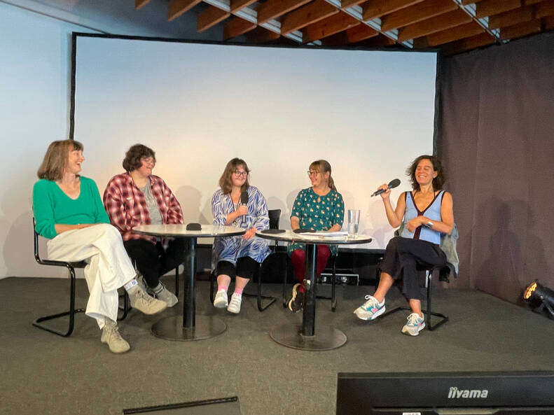 Stella Luncke hat uns anschließend auf die Bühne gerufen. Sie ist Hörspielautorin. Sie und Josef Maria Schäfers haben das Hörspiel mit uns gemacht. Stella Luncke hat beim Hörspielfest moderiert. Sie hat uns Fragen zu unserem Hörspiel gestellt. Wir konnten erzählen, wie wir es aufgenommen haben und was uns daran wichtig war.