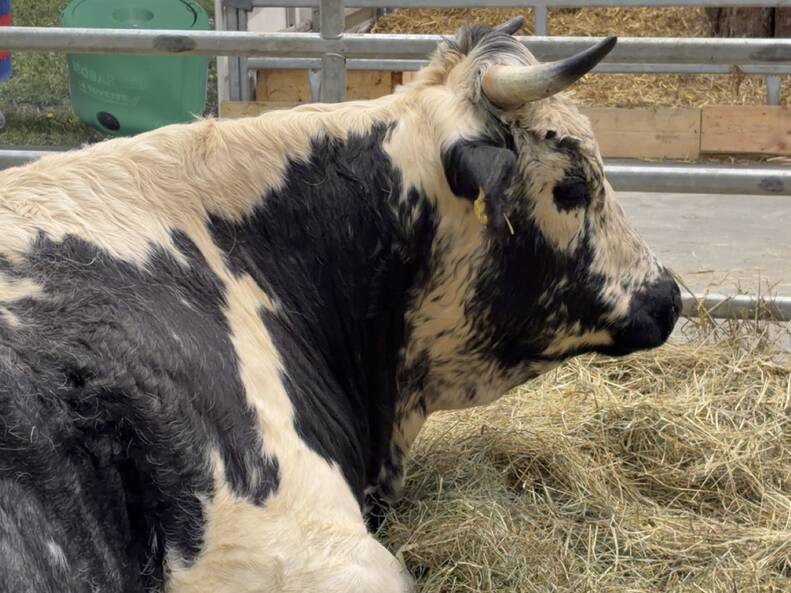 In der Tierhalle schauen wir uns immer Tiere an, wie Kühe, Bullen, Schweine, Esel und Pferde.
