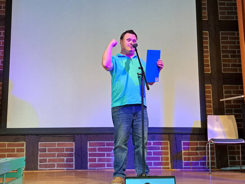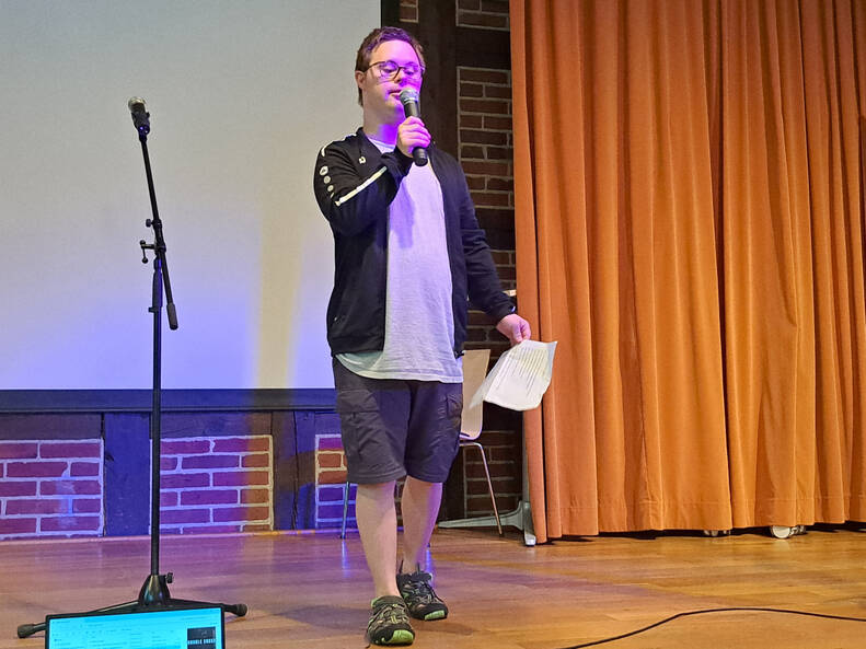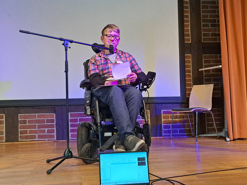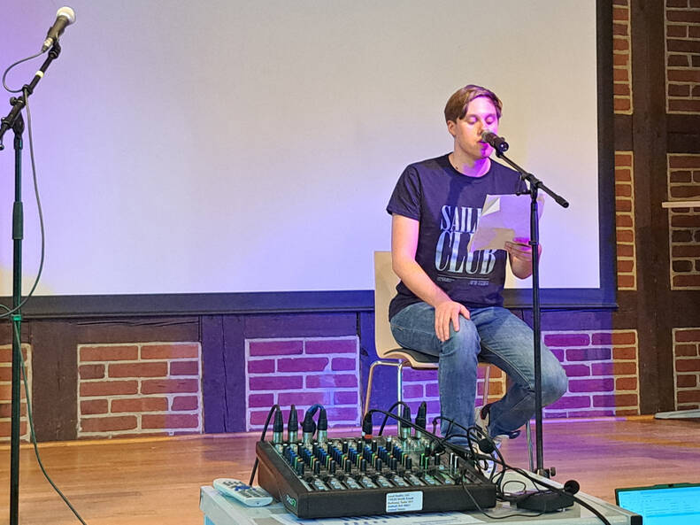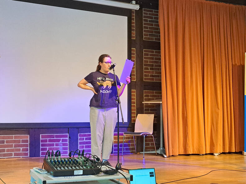 Für einen Poetry Slam erfinden Menschen Texte in ihrer Fantasie. Sie treten damit auf einer Bühne auf.