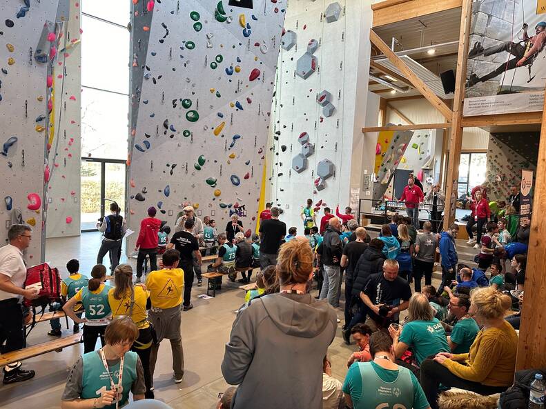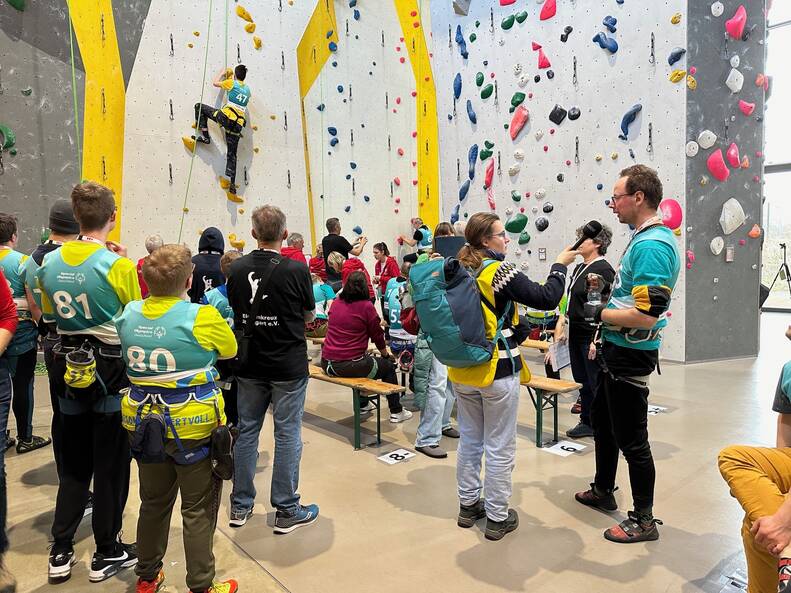 Am nächsten Tag waren wir in Weimar in einer Kletter∙halle. Dort sind Frauen und Männer ziemlich steile Wände hoch∙geklettert. Die Wände waren 12 Meter hoch. Nicht immer haben es alle bis ganz oben geschafft. Das machte aber nichts. Denn es ist mutig so eine Wand hoch∙zuklettern. Es gab auch Menschen, die nicht sehen konnten. Sie sind auch geklettert. Sie haben die Wand und die Kletter∙griffe gefühlt. Bei einem Wettbewerb hat ein blinder Mann die Gold∙medaille gewonnen.