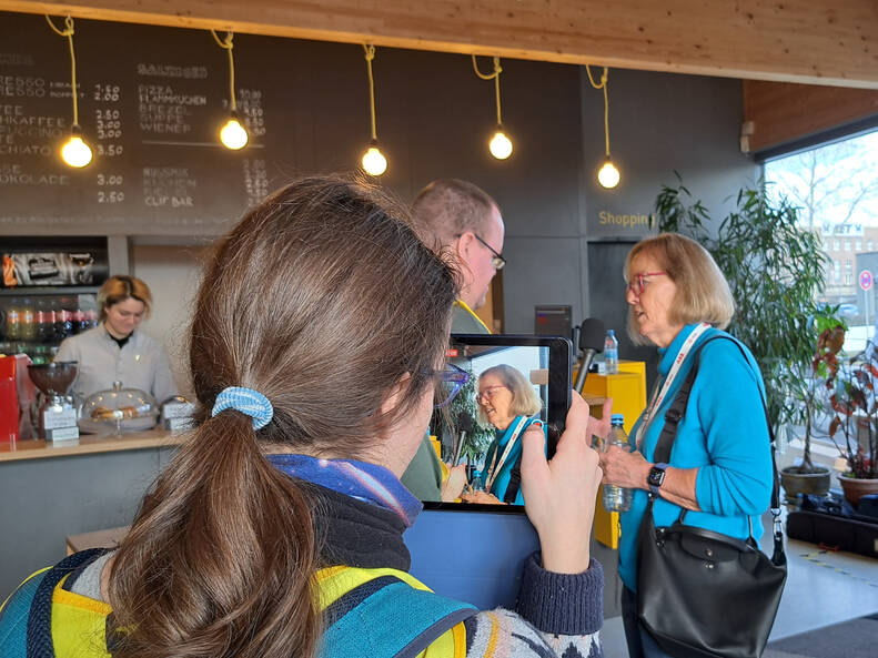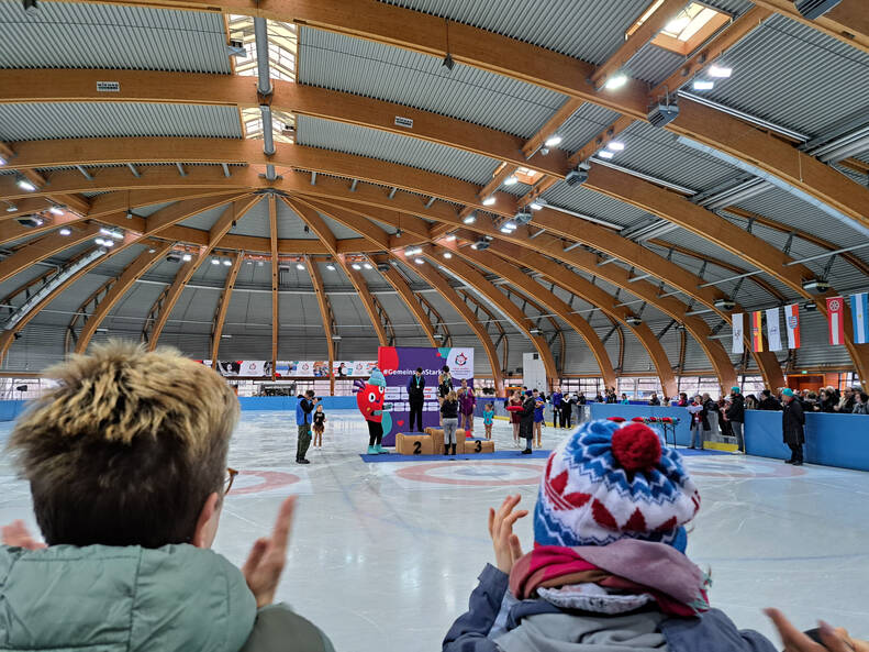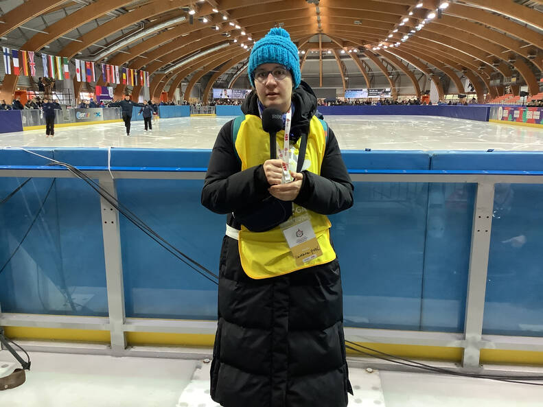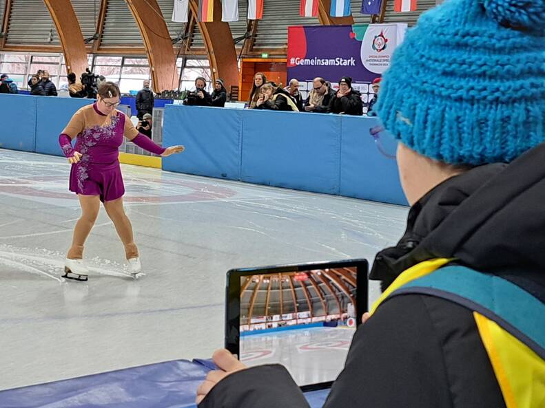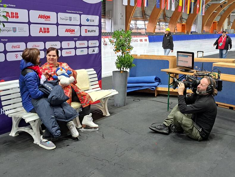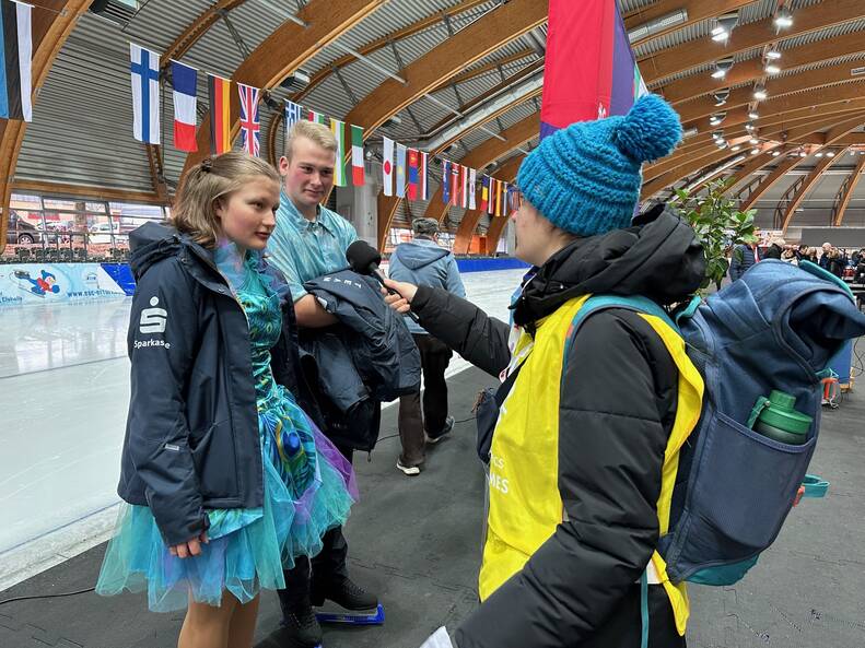 In Erfurt fanden Wett∙bewerbe auf dem Eis statt. Die Eiskunst∙läufer und die Eiskunst∙läuferinnen tanzten auf dem Eis. Besonders schön sah das beim Paarlauf aus. Die Wett∙bewerbe waren für Frauen und Männer gemeinsam. Und beim Paarlaufen konnten 2 Frauen laufen, ein Mann und eine Frau oder auch 2 Männer. Das sind andere Regeln als bei den Olympischen Spielen. Wir haben dort Interviews gemacht und gefilmt. Es war aufregend. Viele Sportler und Sportlerinnen waren glücklich. Und wir hatten viel Spaß.