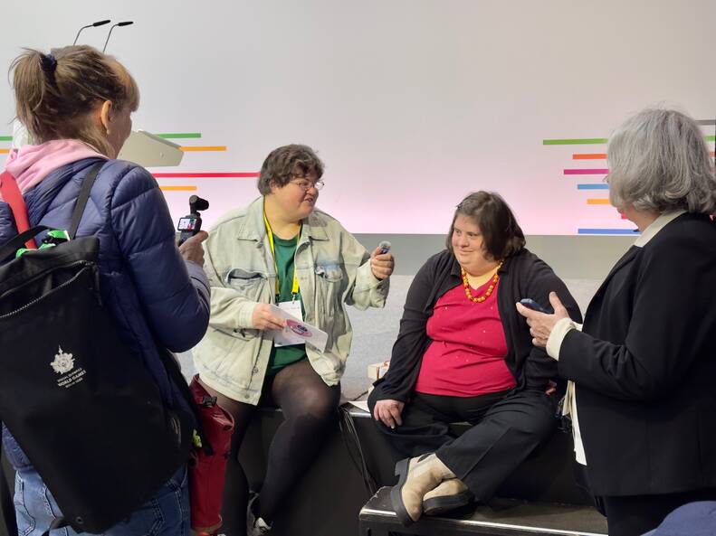 Es gab ein sehr interessantes Programm. Am besten hat uns die Veranstaltung der Selbstvertreter*innen gefallen. Auf der Bühne saßen Menschen aus Deutschland, Nepal, Libanon und Bulgarien. Für alle war klar, wie wichtige es ist: seine Rechte zu kennen, für sich selbst zu sprechen und eigene Entscheidungen zu treffen. Dafür müssen natürlich die Voraussetzung stimmen: Die Menschen brauchen eine technische Ausstattung, eine barrierefreie Umgebung, gute Assistenz und Schulungen.