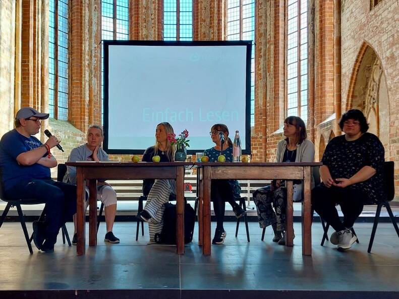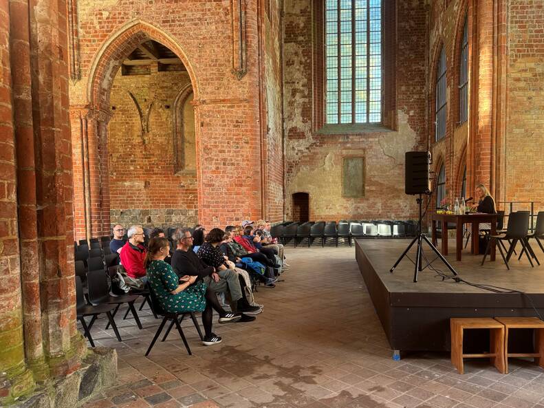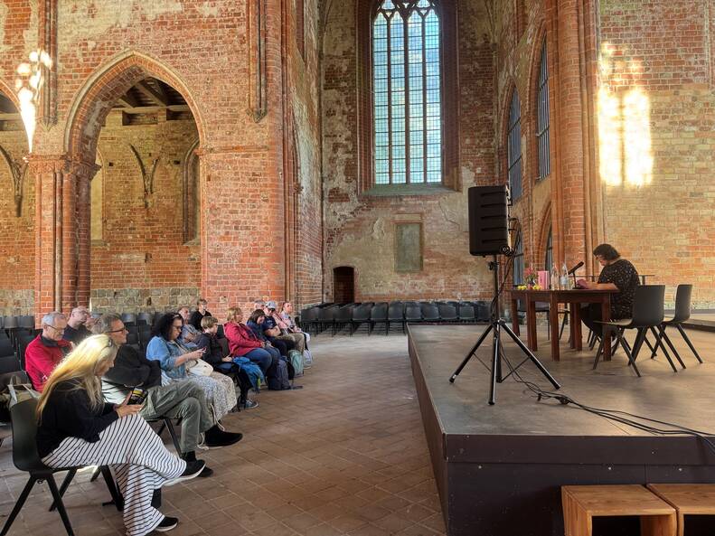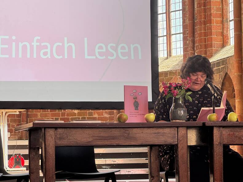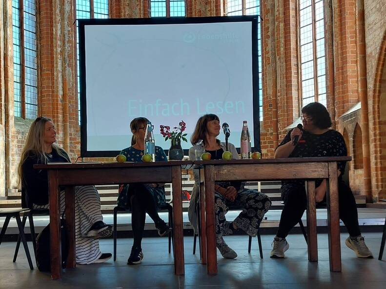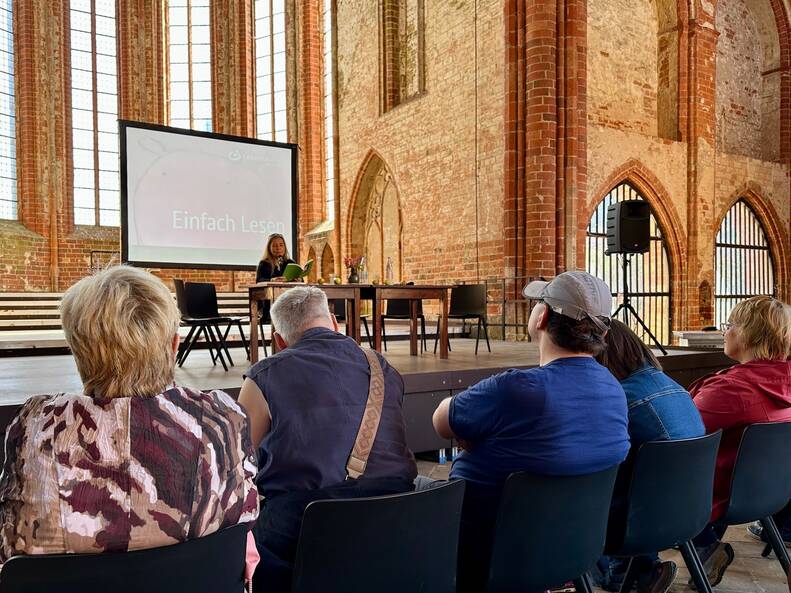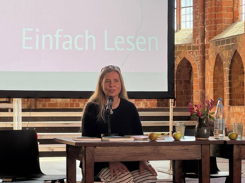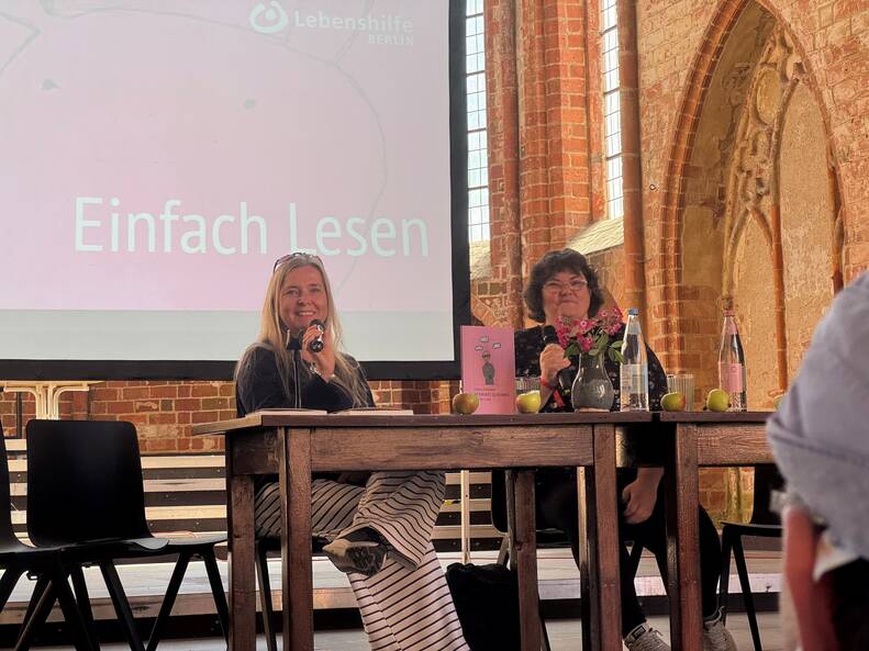 Am 7. September waren wir zu einem Bücherfest ins Kloster Chorin eingeladen. 1,5 Stunden konnten wir zeigen, welche Kunst manchmal in der Einfachheit liegt. Wir haben Kultur in Einfacher Sprache vorgestellt. Cordula Schürmann und Alexandra Lüthen haben gelesen. Es gab Gespräche. Und die Zuhörer und Zuhörerinnen konnten unser Hörspiel anhören.