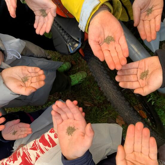 Anschließend tauchten die Kinder intensiv in das Thema "Igel" ein. Sie lernten die wichtigsten Arten und deren Systematik kennen, erforschten die Zusammenhänge und Ursachen des Igelsterbens anhand verschiedener Kurzfilme und tauschten sich über eigene Erfahrungen in ihrer direkten Nachbarschaft aus. Dann wurde es noch spannender: Die Schülerinnen und Schüler der Grundschule am Kollwitzplatz wurden selbst aktiv! Sie säten eine Wildblumenwiese, pflanzten Obstbäume und legten einen "ewigen" Laubhaufen an. Damit können Insekten und Igel ihren Lebensraum zurückgewinnen, den sie durch Lebensraumzerschneidung in der Gegend weitgehend verloren haben. Ein besonderer Fokus fiel auf den Insektenschutz als wichtige Lebensgrundlage für den Igel. Darum durfte dann auch jedes Kind eine Raupe in einem Raupenaufzuchtsack anbinden. Bei dieser Methode kann sich die Larve bis zum fertigem Falter entwickeln, ohne gefressen zu werden, und anschließend nach der Freilassung durch den jeweiligen Schüler für Nachwuchs sorgen.